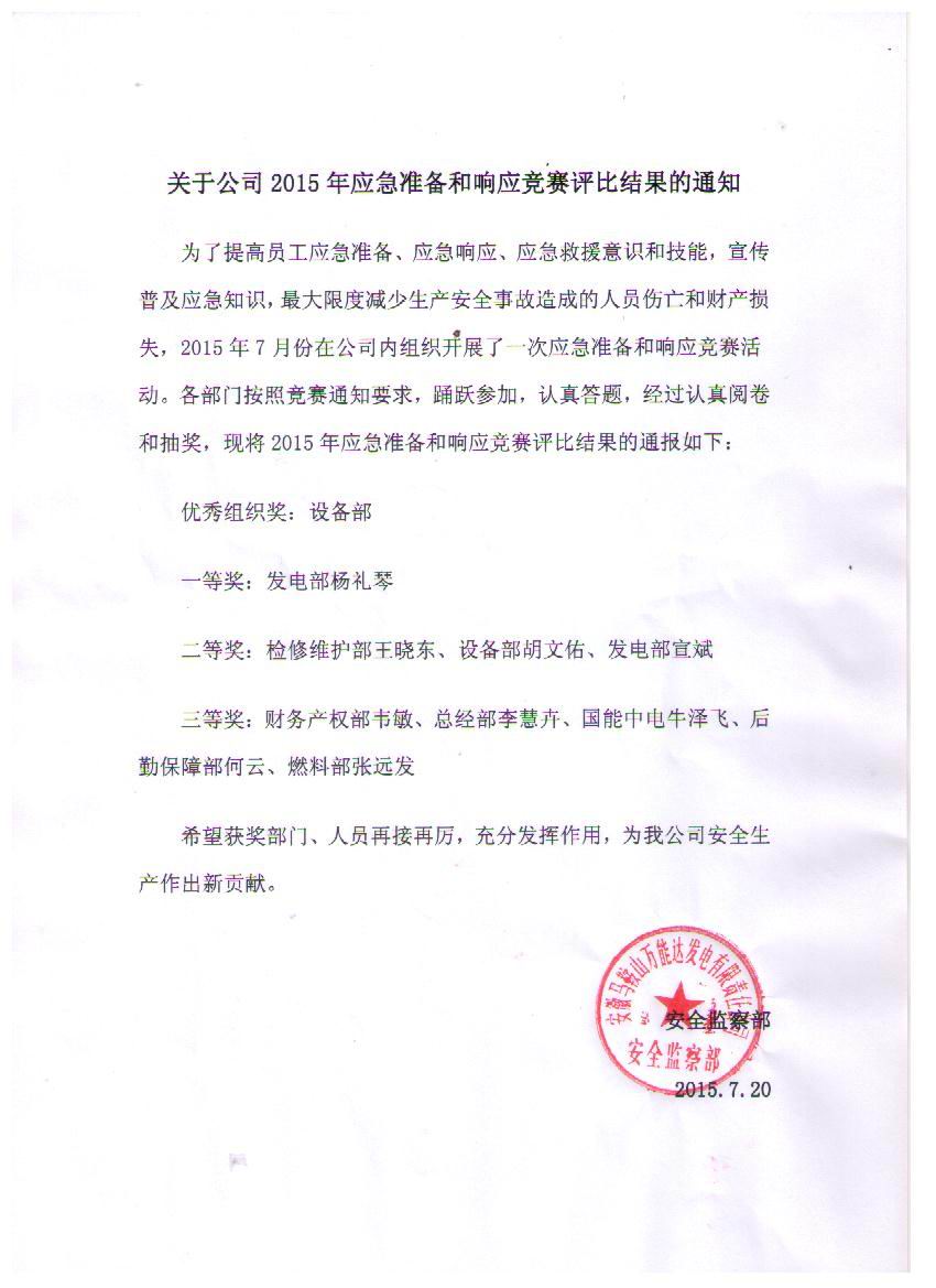 為了提高員工應急準備、應急響應、應急救援意識和技能,宣傳普及應急知識,馬鞍山項目部業(yè)主萬能達電廠于2015年7月組織開展了應急競賽,我公司牛澤飛獲得三等獎,牛澤飛是獲得獎項的唯一非電廠員工,牛澤飛的獲獎及展示了公司風貌,又體現項目的安全教育頗有成效,既了強化了員工的安全意識,也提高了員工處理應急突發(fā)情況的能力。