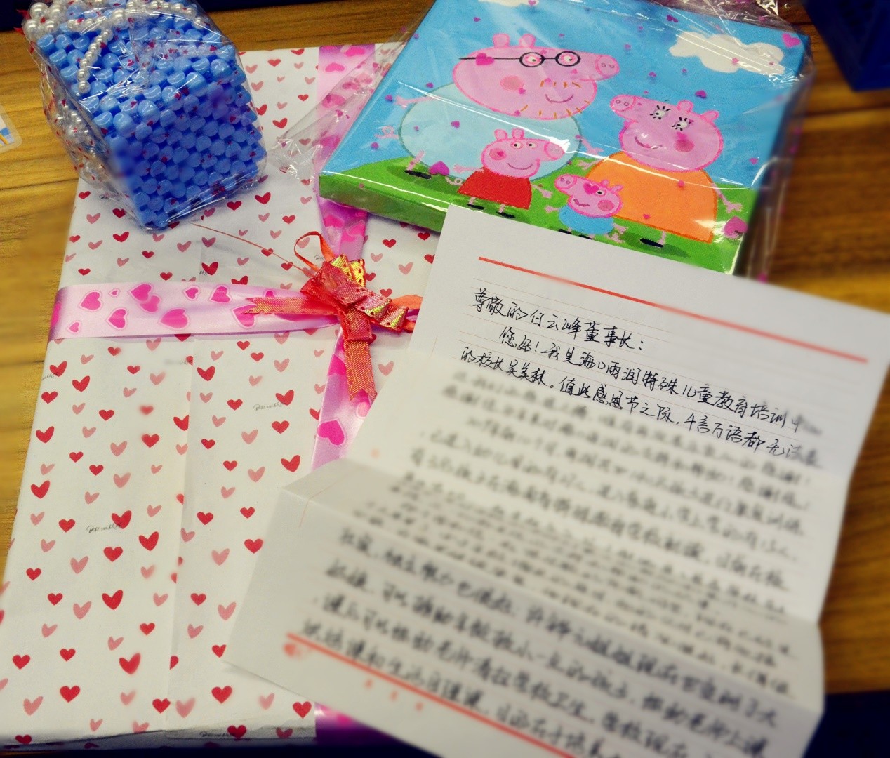 寫信的人是??谟隄櫶厥鈨和逃嘤?xùn)中心校長吳美林,禮物則是由學(xué)校的自閉癥兒童及智力發(fā)育遲緩兒童親手制作,一同寄過來的還有一沓厚厚的照片,那是學(xué)校孩子們接受教育和康復(fù)訓(xùn)練的活動(dòng)掠影。