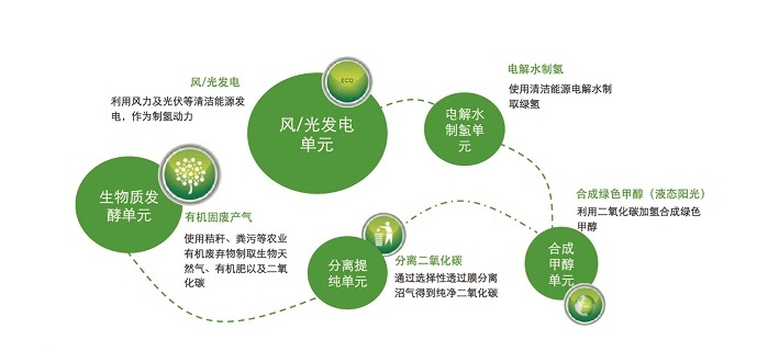 風(fēng)光生物質(zhì)聯(lián)合制儲(chǔ)氫(液態(tài)陽(yáng)光)一體化碳中和技術(shù)是國(guó)能中電以國(guó)家“雙碳”目標(biāo)為指引,在自身優(yōu)勢(shì)的生物質(zhì)能技術(shù)基礎(chǔ)之上,打破產(chǎn)業(yè)壁壘,融通產(chǎn)業(yè)鏈條,成功孵化的以風(fēng)能、太陽(yáng)能、生物質(zhì)能、氫能等清潔能源為代表的一體化碳中和項(xiàng)目,該項(xiàng)目主要包括風(fēng)力發(fā)電單元、電解水制氫單元、生物質(zhì)發(fā)酵產(chǎn)氣單元、合成甲醇單元,在消納秸稈等有機(jī)固廢的同時(shí),利用清潔能源為氫能產(chǎn)業(yè)提供綠色甲醇,通過(guò)能源循環(huán)利用最終實(shí)現(xiàn)碳中和。該項(xiàng)目建立了全新的清潔能源產(chǎn)業(yè)鏈協(xié)同利用模式,是國(guó)能中電碳中和路徑的有益實(shí)踐,也是我國(guó)能源結(jié)構(gòu)重整的創(chuàng)新之舉。