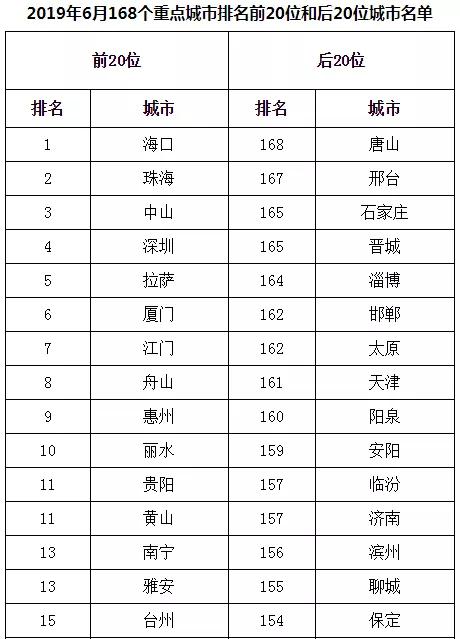 2019年6月,168個(gè)重點(diǎn)城市中唐山、邢臺(tái)、石家莊市等20個(gè)城市空氣質(zhì)量相對(duì)較差(從第168名到第149名);海口、珠海、中山市等20個(gè)城市空氣質(zhì)量相對(duì)較好(從第1名到第20名,見(jiàn)附表1)。