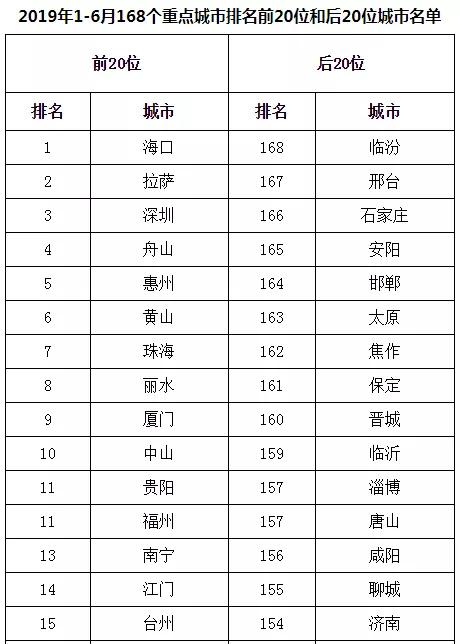 2019年1-6月,168個(gè)重點(diǎn)城市中臨汾、邢臺(tái)、石家莊市等20個(gè)城市空氣質(zhì)量相對(duì)較差(從第168名到第149名);海口、拉薩、深圳市等20個(gè)城市空氣質(zhì)量相對(duì)較好(從第1名到第20名,見(jiàn)附表2)。