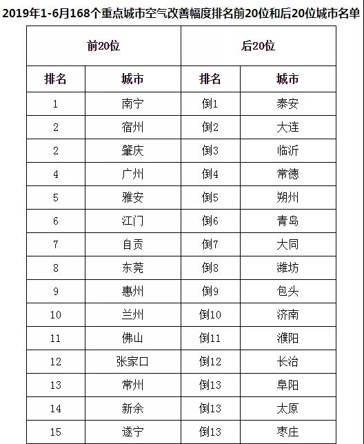 從空氣質(zhì)量同比改善程度看,2019年1-6月,168個(gè)重點(diǎn)城市中南寧、宿州、肇慶市等20個(gè)城市空氣質(zhì)量改善幅度相對(duì)較好(從第1名到并列第19名);泰安、大連、臨沂市等20個(gè)城市空氣質(zhì)量改善幅度相對(duì)較差(從倒數(shù)第1名到倒數(shù)第20名,見(jiàn)附表3)。